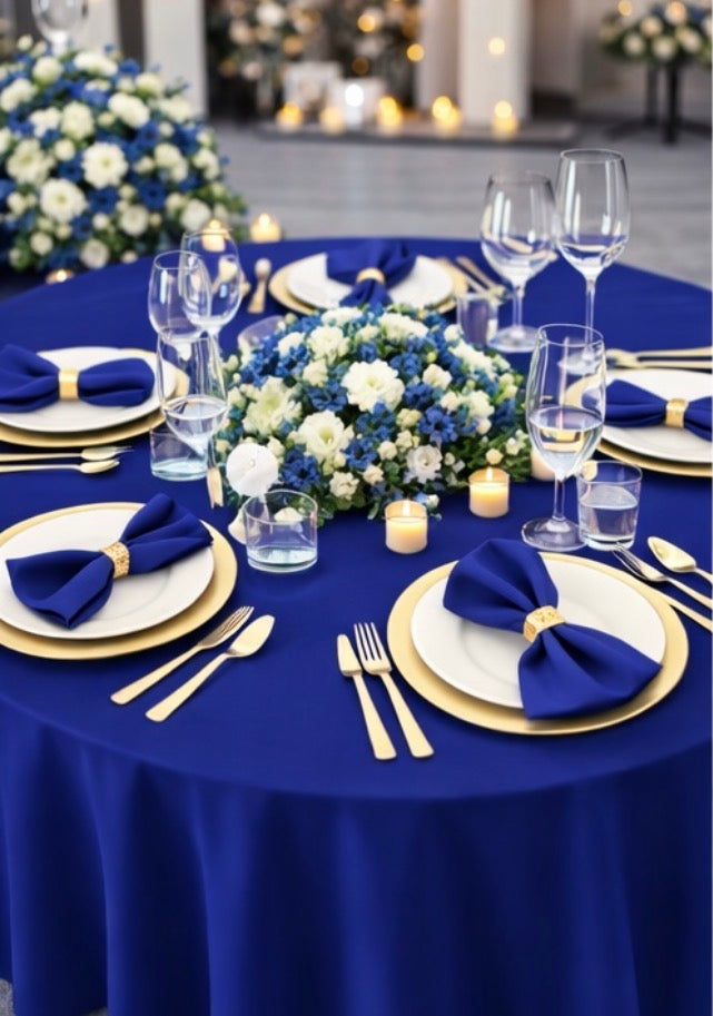The Polyester 120” Round Tablecloth in Royal blue encapsulates a sense of delicate beauty and effortless sophistication. With its muted and versatile tone, this tablecloth has the ability to transform any setting into one of understated elegance